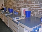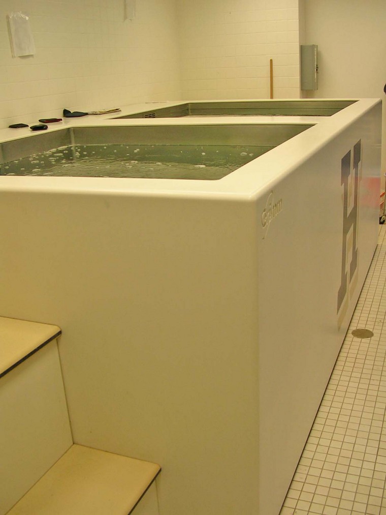 In addition to these rehabilitation modalities, the athletic training clinic also features a state of the art rehabilitation tub. This device, the largest of its kind, boasts an environmentally friendly design (using the energy generated for cooling one tank to provide heat for the other tank) of two tanks, which each hold 650 gallons with a capacity of 10 student-athletes.